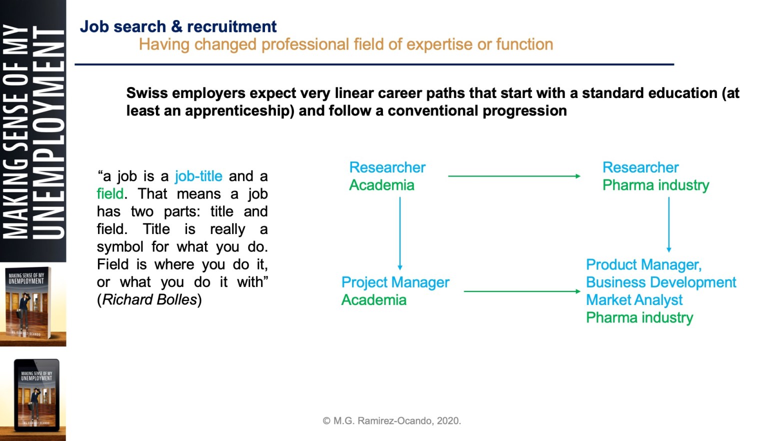 Swiss employers expect very linear career paths that start with a standard education (at least an apprenticeship) and follow a conventional progression. Even though the Swiss education system is permeable (see the section ‘The Swiss education system’ in Chapter 2), it generally frowns upon career changes, in particular when they occur several years after the job seeker’s first career choice. There is an exception, though, and that is when the career change involves moving into a market with high demand (like the case of Weston, who became a primary school teacher in 1972 during a period of high demand for professionals in this area). In general, I would describe the situation as Rose puts it: ‘You have to fit into the Swiss box in order to get hired in Switzerland.’ Given that the majority of the Swiss population choose their career at a very early age, it seems that it is generally expected that people commit to their professional field and/or function for life. For Robert, a Swiss citizen himself, many Swiss employers seem to go as far as to expect that job seekers will have known from a very early age that they want to work for the company they are applying to. Of course, there are some elements of subjectivity in these assessments, but the bottom line is that career changes in Switzerland are frowned upon (unless they are small and gradual or market-driven). This was likely the reason behind the eventual success of Paige’s research–business transition. Like me, Paige used her EMBA as a way to transition from a purely research function to a business-related function in the pharmaceutical industry. Unlike me, however, after her PhD she worked directly in her target industry (pharmaceutical), as a scientist. The change that Paige made was much more gradual: first the industry and then the job type. She also applied for a business post highly relevant to what she did as a scientist (a type of management of preclinical studies). Luke also tried to make a gradual career change, from business analyst to data scientist in the banking industry. His interest in making this change, however, did not survive the first application rejections.
