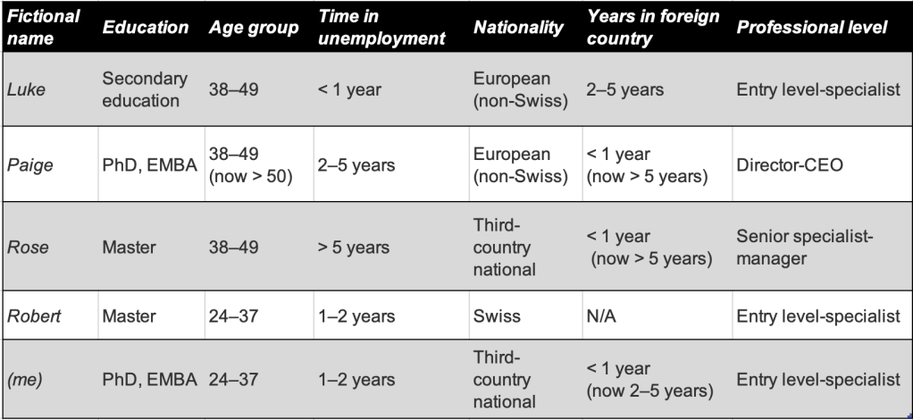 I must admit that for some jobs, the type of studies other candidates had recently finished could be seen as more directly relevant. Then again, it could simply be that employers found it easier to shape new recruits according to their specific tastes and needs when they were fresh out of university. The hiring manager of one of the companies with whom I interviewed did, however, mention that their main concern was that I would get bored quickly and leave. Unfortunately, I was unable to convince the company that this would not be the case; there was very little room for discussion. Rose faced similar challenges during her job search. Given that she was highly specialized in a law field that was not relevant in Switzerland, she was forced to search for positions outside of her area of expertise. After having no luck in her search for management positions, she started looking for junior employment opportunities. Fortunately, in her case, an employer was eventually willing to take the risk of hiring an overqualified candidate because the company had a strong need for lawyers; however, it did take a couple of years to find such an employer.